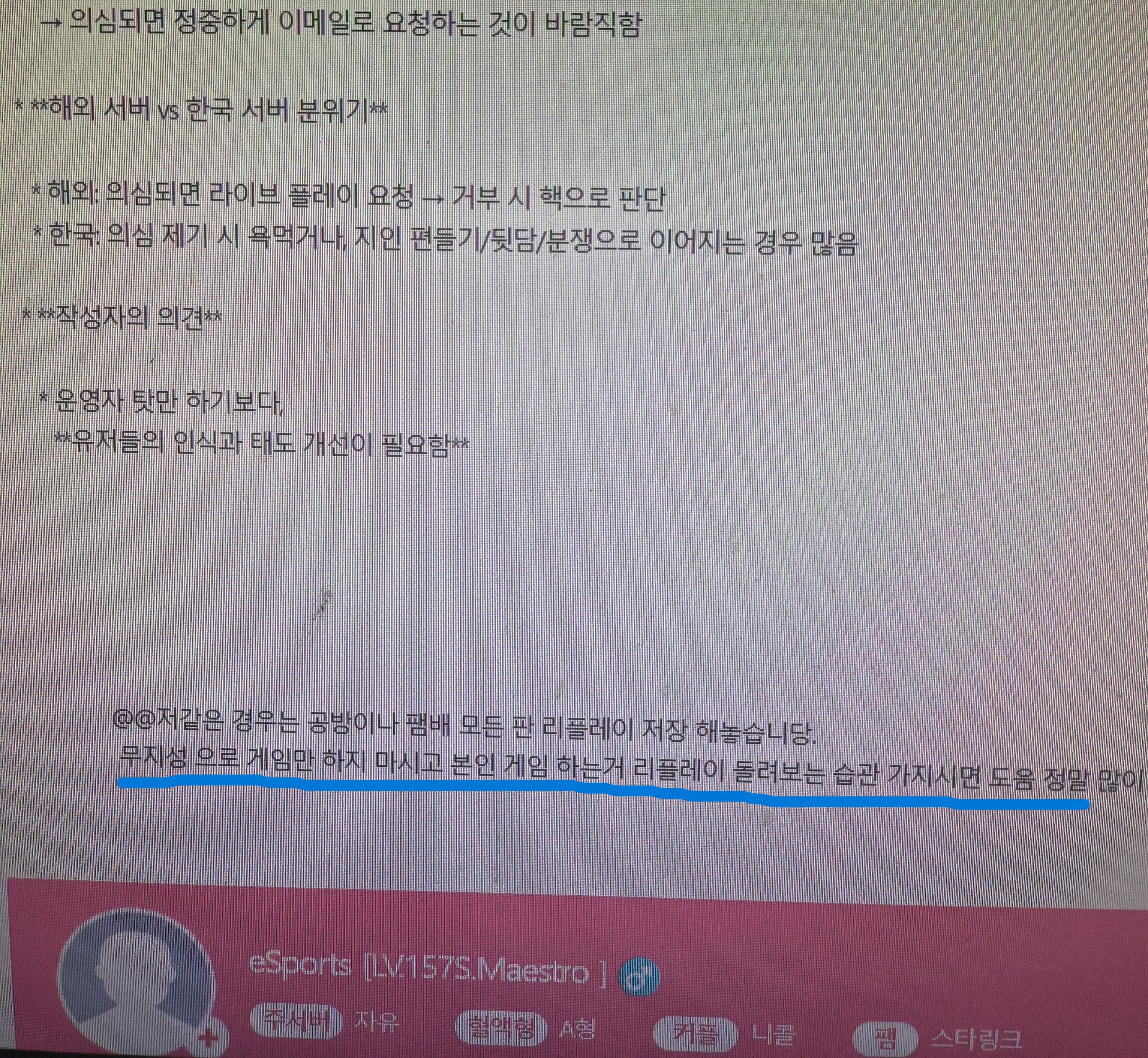 커뮤니티 토크라운지 패션갤러리 앙케이트 Auditoon 개선타령하신분 보세요 작성자 남온조 등록일 2026-04-01 02:20 추천수 0 조회수 130 지보고 핵이라고 하는건 무지성이고지가 자주 리플 저장 안되고 프레임 못밝히는건 뭔 지성이세요?저기요 님부터 개선하세요.키 열심히 치는사람들한테 무지성이라니..님이 그런 말할 권리는 있으세요?지금보니 적 많은건 확실히 알겠다 말하는거 보니까 작성자 명 남온조 레벨 [LV.3몸치] 성별 목록 글번호, 제목, 등록일 순 공지사항 표 번호 제목 작성자 등록일 추천 조회수 공지 [안내] 게임 내 비정상 플레이 제재 안내 2026.03.12 - - 공지 [사전안내] Windows 10 서비스 종료에 따른 지원 중단... 2025.07.31 - - 공지 [안내] 2025.05.15 신규 패처 배포 및 다운로드 안내 2023.12.28 - - 공지 [안내] 윈도우 디펜더(Windows defender) 관련 설정 ... 2021.08.19 - - 공지 [안내] d3dx9_43.dll 오류 발생 시 관련 안내(다이렉... 2022.01.06 - - 공지 [안내] 클라이언트 수동 설치 안내 (240104) 2021.02.04 - - 56864 개선타령하신분 보세요 [5] 남온조 2026.04.01 0 130 56863 "리플레이 저장X =핵" 은 아닙니다 Grand남학생 2026.04.01 2 72 56862 알려주실분 .ㅠㅠ [3] MUSE 2026.03.31 0 189 56861 리플레이 저장X? (핵이라고 단정짓지 마세요 )인식을 ... [15] eSports 2026.03.31 7 614 56857 랭킹 메뉴의 캐릭터 디스플레이 [4] Ken 2026.03.30 0 679 56855 ★ 최고서리2 댄스 Only One - BoA 최고서리2 2026.03.28 0 65 56854 고마워요 영자님~♥ 연인 2026.03.28 0 507 56853 핵유저 퇴치중! [1] 나비천사 2026.03.28 4 518 56851 핵 잡았어요^^ [22] 쌀쌀이 2026.03.27 35 2280 56850 T3 엔터 & 한빛소프트 임직원들!!! 이루빈 2026.03.27 1 205 56849 제가 오디션 게임에서 이루빈 2026.03.27 0 355 56846 키스보내기가 안떠요 [1] 이몽 2026.03.26 0 426 56845 아 봄봄 이벤 맘상 [1] 윤쌤 2026.03.26 0 654 56844 운영자님!! [1] 오라라 2026.03.26 0 582 56843 오디션 게임과 나 ...그리고 이루빈 2026.03.25 2 463 글쓰기 12345678910 제목 글쓴이 검색 검색
