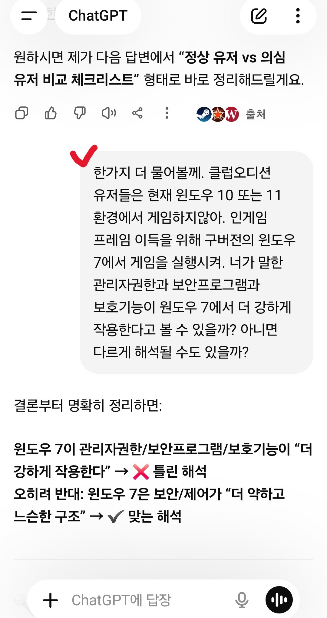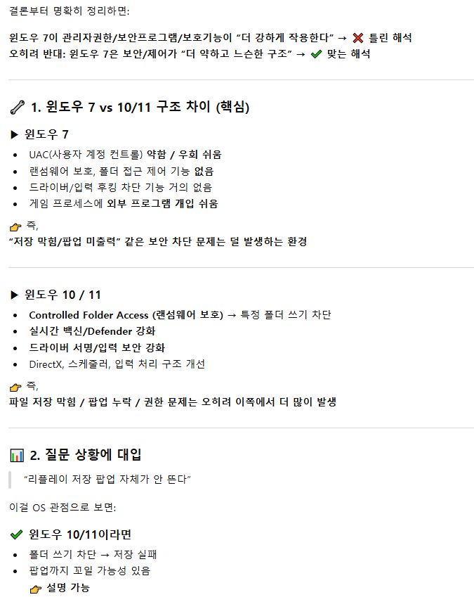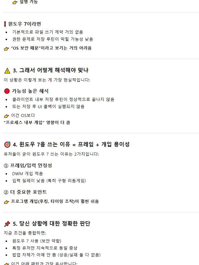 커뮤니티 토크라운지 패션갤러리 앙케이트 Auditoon 저장 오류에 대한 윈도우 차이-ChatGPT 작성자 Grand남학생 등록일 2026-04-03 12:20 추천수 0 조회수 67 아.. 꼭 그렇지도 않네요PC방에서도 저장 잘되긴해서 조금 자세히 설명 부탁해볼게요 작성자 명 Grand남학생 레벨 [LV.61 오디션마스터] 성별 주서버 고수 혈액형 A형 커플 Grand여학생 팸 ♥소버♥[73] 목록 글번호, 제목, 등록일 순 공지사항 표 번호 제목 작성자 등록일 추천 조회수 공지 [이벤트] 맞춰봐요~! 캐치캐치10 이벤트 안내 타콘 2026.04.01 - - 공지 [안내] 게임 내 비정상 플레이 제재 안내 2026.03.12 - - 공지 [사전안내] Windows 10 서비스 종료에 따른 지원 중단... 2025.07.31 - - 공지 [안내] 2025.05.15 신규 패처 배포 및 다운로드 안내 2023.12.28 - - 공지 [안내] 윈도우 디펜더(Windows defender) 관련 설정 ... 2021.08.19 - - 공지 [안내] d3dx9_43.dll 오류 발생 시 관련 안내(다이렉... 2022.01.06 - - 공지 [안내] 클라이언트 수동 설치 안내 (240104) 2021.02.04 - - 56901 리플레이 저장 오류는 환경문제? 자연소리 2026.04.03 0 56 56900 재미로 보시고(AI=정확X) 인식을 바꿀 필요는 있겠네... [3] Grand남학생 2026.04.03 1 111 56899 프레임변조/팩존/저장오류 자세히-ChatGPT Grand남학생 2026.04.03 0 89 56898 저장 오류에 대한 윈도우 차이-ChatGPT Grand남학생 2026.04.03 0 67 56897 리플레이 저장 팝업 아예 안뜨고 먹통이,,,-ChatGPT Grand남학생 2026.04.03 0 93 56896 시원하게 인증가자 짜치네 2026.04.03 0 130 56895 문제아들 또 사고치고 다니나 보네 자연소리 2026.04.03 3 158 56893 미드 / 최자 / 팔로알토 니가더시끄러 2026.04.02 4 546 56892 eSports님 니가더시끄러 2026.04.02 6 1157 56891 그리고 코인<->촉진제 교환가능한것도 [3] 데덴네 2026.04.02 2 188 56890 영자님 가든 물,비료 업뎃해준건 좋은데요.. 데덴네 2026.04.02 3 171 56889 ㅈ ㅐ밌당 김초극 2026.04.02 0 299 56888 선인장코인교환이ㅋㅋㅋㅋㅋㅋㅋ 현신 2026.04.02 3 207 56887 드르렁쿨쿨 [4] 이신영 2026.04.02 3 437 56886 이 상의 정보 아시는 분 [1] 서비스 2026.04.02 0 337 글쓰기 12345678910 제목 글쓴이 검색 검색