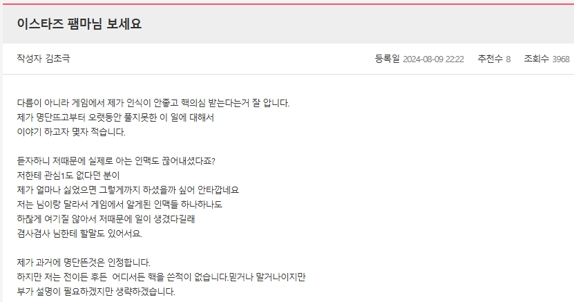 커뮤니티 토크라운지 패션갤러리 앙케이트 Auditoon 기다렸다 초극아 작성자 왕관의무게 등록일 2026-04-11 03:23 추천수 8 조회수 374 니가 언제 글 쓰나 계속 기다렸다 진짜 문제가 많구나너 엠비티아이 극N이지?뭔 상상을 그리 잘하면 저렇게 어이없이 웃긴 소설이 나오냐?짱마크는 어차피 개미왕 말고는 못먹는건데 뭐하러 저짓거리를 해 존나 꼬였네... 개미왕한테 뭐라 해야지 왜 엄한 사람들한테 핵이라고 말도 안되는 걸로 욕하고 억지로 몰아가고 있냐 ???진짜 멍청하구나니 친구 승철이가 바빠서 하루 안온거 가지고그만 끼워 맞춰라 추하다적은 항상 니 주변에 있어 가스라이팅이나 당하지마 영원한 핵이냐고 물었지? 그건 유저가 알아서 판단하겠지 작성자 명 왕관의무게 레벨 [LV.1몸치] 성별 목록 글번호, 제목, 등록일 순 공지사항 표 번호 제목 작성자 등록일 추천 조회수 공지 [안내] 2026.04.09 신규 패처 배포 및 다운로드 안내 2023.12.28 - - 공지 [안내] 게임 내 비정상 플레이 제재 안내 2026.03.12 - - 공지 [사전안내] Windows 10 서비스 종료에 따른 지원 중단... 2025.07.31 - - 공지 [안내] 윈도우 디펜더(Windows defender) 관련 설정 ... 2021.08.19 - - 공지 [안내] d3dx9_43.dll 오류 발생 시 관련 안내(다이렉... 2022.01.06 - - 공지 [안내] 클라이언트 수동 설치 안내 (240104) 2021.02.04 - - 57059 ㅉ ㅣ질이 1등은 너야 왕관의무게 2026.04.11 0 70 57058 기다렸다 초극아 [2] 왕관의무게 2026.04.11 8 374 57057 무슨 연기 학원도 아니고 ㅋㅋㅋㅋ [2] 초극 2026.04.11 8 129 57056 팅김.. [1] 깜잨 2026.04.11 0 76 57055 ★ 최고서리2 댄스 NCT 127 - Cherry Bomb 최고서리2 2026.04.10 0 19 57054 캐릭터 그래픽 왜이래요 히라사와 2026.04.10 0 299 57052 영자님...... 닉네임이 도대체 어디까지 내려갈건가요... [1] 안오냐 2026.04.10 0 433 57051 임시점검을 해서라도 고쳐줄생각이 없는건가요? [2] 하은 2026.04.10 2 562 57050 운영자님 [5] 못생 2026.04.10 0 520 57049 복귀했는데 넘어려움 꽃채희 2026.04.10 0 211 57048 윈7 이슈로 김초극 2026.04.10 0 537 57046 고쳐주시던 임시점검을 하던가 해요 하은 2026.04.10 2 348 57045 운영자님 [5] 정해인 2026.04.10 2 675 57044 영자님 제발 선물함 전체받기 좀 만들어주세요 [1] 김채원 2026.04.10 0 331 57041 히든미션 뜨면 팅기는 건 왜 안고쳐줘요 [2] 성한빈 2026.04.10 1 343 글쓰기 12345678910 제목 글쓴이 검색 검색