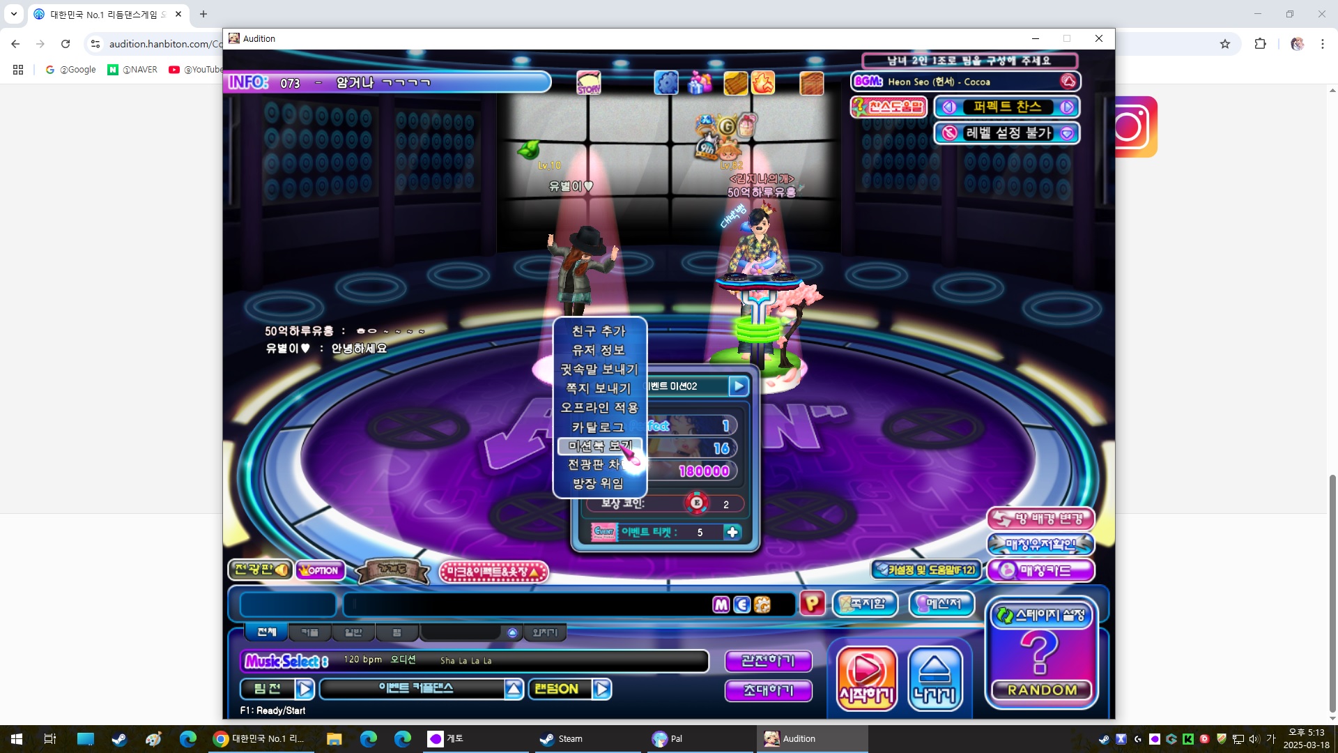 개인화 영역 및 게임 스타트 오디션 게임 스타트 오디션 게임 다운로드 한게임 아이디로 로그인 해주세요. HANGAME 로그인 PC방 혜택보기 오디션에 오신 것을 환영합니다! 게임 시작 전에 게임 약관에 동의해 주세요. 약관 동의하기 오디션에 오신 것을 환영합니다! 나의 캐릭터를 먼저 생성해주세요! 캐릭터 만들기 보유 캐시 G코인 : 오디션캐시 : 캐시충전 내 정보 변경 > 로그아웃 > PC방 혜택보기 기타 서비스 이용하기 오디션쿠폰등록 오디션멤버십보기 PC방혜택보기 고객센터 서비스 이용하기 1:1 문의 FAQ