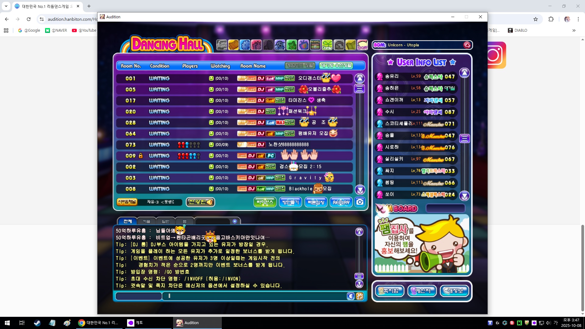 개인화 영역 및 게임 스타트 오디션 게임 스타트 오디션 게임 다운로드 한게임 아이디로 로그인 해주세요. HANGAME 로그인 PC방 혜택보기 오디션에 오신 것을 환영합니다! 게임 시작 전에 게임 약관에 동의해 주세요. 약관 동의하기 오디션에 오신 것을 환영합니다! 나의 캐릭터를 먼저 생성해주세요! 캐릭터 만들기 보유 캐시 G코인 : 오디션캐시 : 캐시충전 내 정보 변경 > 로그아웃 > PC방 혜택보기 기타 서비스 이용하기 오디션쿠폰등록 오디션멤버십보기 PC방혜택보기 고객센터 서비스 이용하기 1:1 문의 FAQ