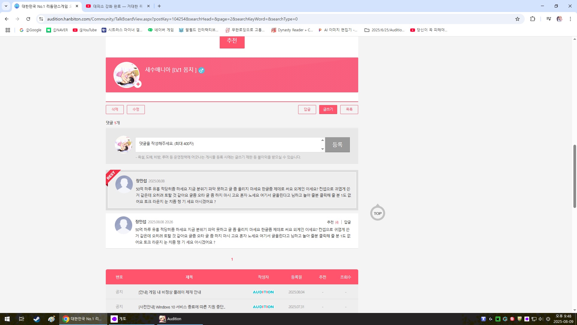커뮤니티 토크라운지 패션갤러리 앙케이트 Auditoon zㅋㅋㅋㅋㅋㅋㅋㅋㅋㅋㅋㅋㅋㅋㅋㅋㅋㅋ…???… 작성자 우타나리커플 등록일 2025-08-09 21:52 추천수 0 조회수 429 아니저애글애댓글달아쥬신분아…ㄳ하고연…왜걔속님소개만걔속하시는거얘요?!저두말점하개이어쥬시면안돼나여… … … ※님말할때마다그러셔서저가넘나웃기고연할말이옵내여※☆ㅋㅋㅋㅋㅋㅋㅋㅋㅋㅋㅋㅋㅋㅋㅋㅋㅋㅋㅋㅋㅋㅋㅋㅋㅋㅋㅋㅋㅋㅋㅋ☆ 작성자 명 우타나리커플 레벨 [LV.1 몸치] 성별 주서버 자유 혈액형 O형 커플 - 팸 - 목록 글번호, 제목, 등록일 순 공지사항 표 번호 제목 작성자 등록일 추천 조회수 공지 [안내] 게임 내 비정상 플레이 제재 안내 2025.12.04 - - 공지 [사전안내] Windows 10 서비스 종료에 따른 지원 중단... 2025.07.31 - - 공지 [안내] 2025.05.15 신규 패처 배포 및 다운로드 안내 2023.12.28 - - 공지 [안내] 윈도우 디펜더(Windows defender) 관련 설정 ... 2021.08.19 - - 공지 [안내] d3dx9_43.dll 오류 발생 시 관련 안내(다이렉... 2022.01.06 - - 공지 [안내] 클라이언트 수동 설치 안내 (240104) 2021.02.04 - - 55543 ▶충격◀오디션홀릭유져애한마디 [1] 우타나리커플 2025.08.25 0 189 55542 챠희☞☜님방애서인생샷(찰칵) [1] 우타나리커플 2025.08.24 0 330 55541 기본 경험치 획득 수치 아시는 분 계실까요?? [1] 적호 2025.08.24 0 513 55533 경험치 사라진분 안계신가요 ? 한비님도 봐주세요. [4] 애원 2025.08.23 1 698 55532 Tip)노쏠팔→해석해듀립니다>_ㅇ 새수매니아 2025.08.23 0 216 55531 s님들아컵댕미쳣음 [1] 우타나리커플 2025.08.23 0 342 55530 경험치 이벤트 아시눈 분 계실까요? [7] 한유라 2025.08.23 0 665 55529 ★최고서리2 댄스 EMERGENCY 911 BUDOTS- LRNCE MIX 최고서리2 2025.08.22 0 60 55528 idea)InsaneFlower 새수매니아 2025.08.22 0 107 55526 T3 엔터 비트업 담당자 !!! 이정은♀ 2025.08.22 0 188 55525 그냥 얼핏밧는데 데미트리 2025.08.22 0 373 55524 idea)매미가쥼 우타나리커플 2025.08.22 0 96 55523 이젠 깨끗하게 잊고 살아가고 싶다.!!! 이정은♀ 2025.08.21 1 397 55521 올스타 샵 [3] 유이쁘 2025.08.21 0 701 55520 s님들아여기어떻해… 새수매니아 2025.08.21 0 117 글쓰기 31323334353637383940 제목 글쓴이 검색 검색