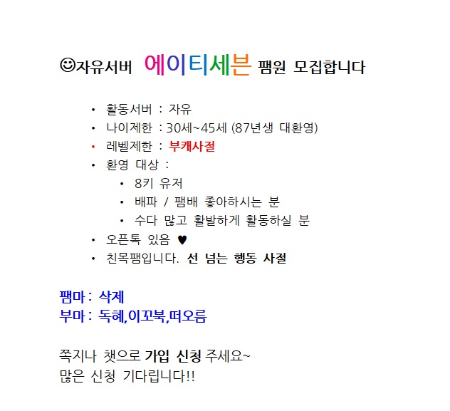 [ 에 이 티 세 븐 ] 자 유 섭 팸 원 모 집 ♥